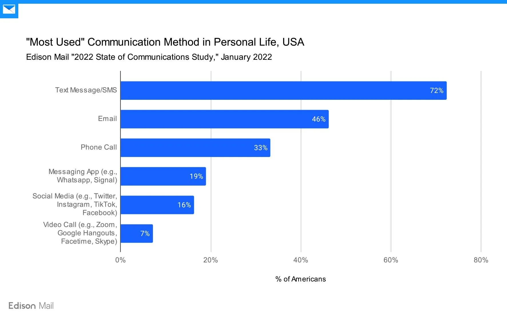 Nearly all Americans use phone calls, text messages, and emails to communicate in their personal lives, and most use video calls and social media. But when it comes to the most frequently used (primary or secondary) method of connecting with each other, nearly three quarters (72%) of the country relies on text message/SMS and nearly half (46%) relies on email.