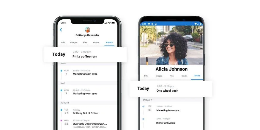 On the Emails tab, you’re able to view, as is obvious by the name, the last twenty emails they’ve sent your way. Lastly, the Events tab is home to the events you’ve had with that person, all events from the previous three months and all events in the coming three months.